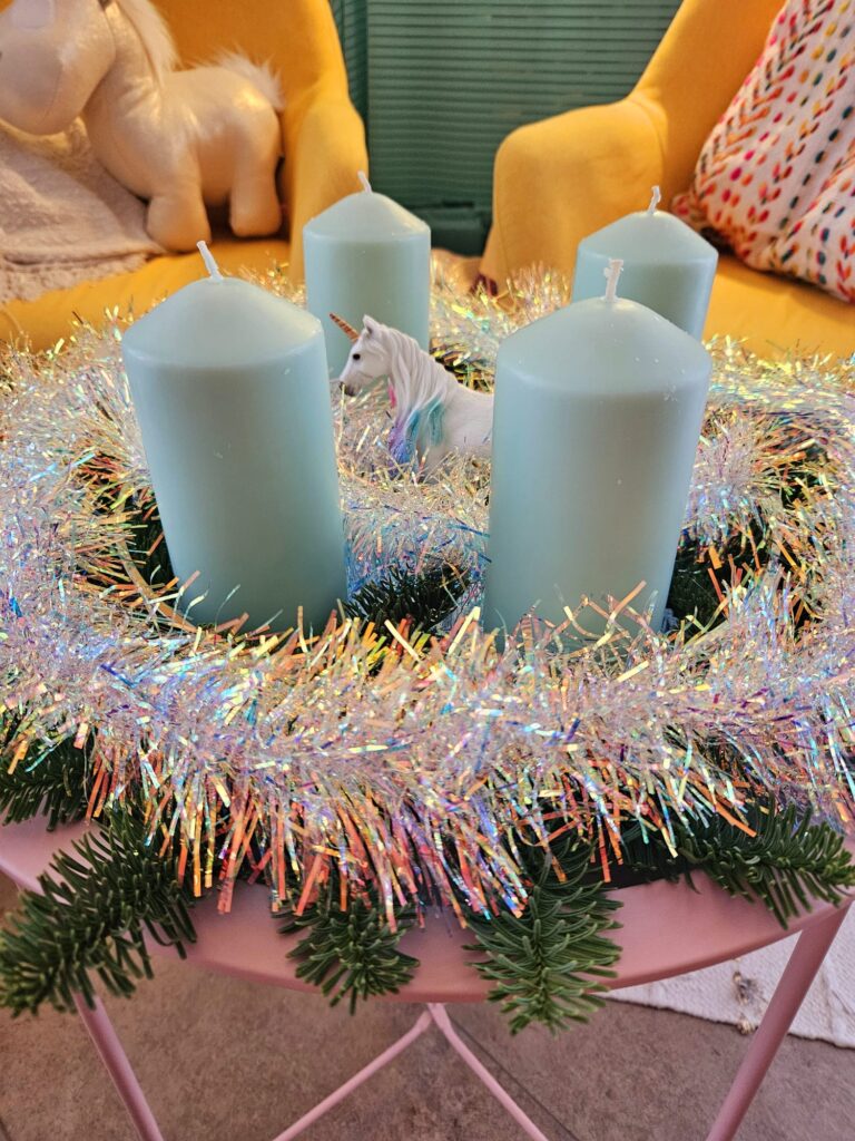 Ich dekoriere sehr gerne meine Wohnung , gestalte alles schön mit Lichterketten und bin sehr farbenfroh. Deswegen habe ich mir dieses Jahr einen Wunsch erfüllt und mir einen „ausgefallenen“ Adventskranz gestaltet. Zu einem magischen Kranz durfte natürlich das Einhorn* nicht fehlen !