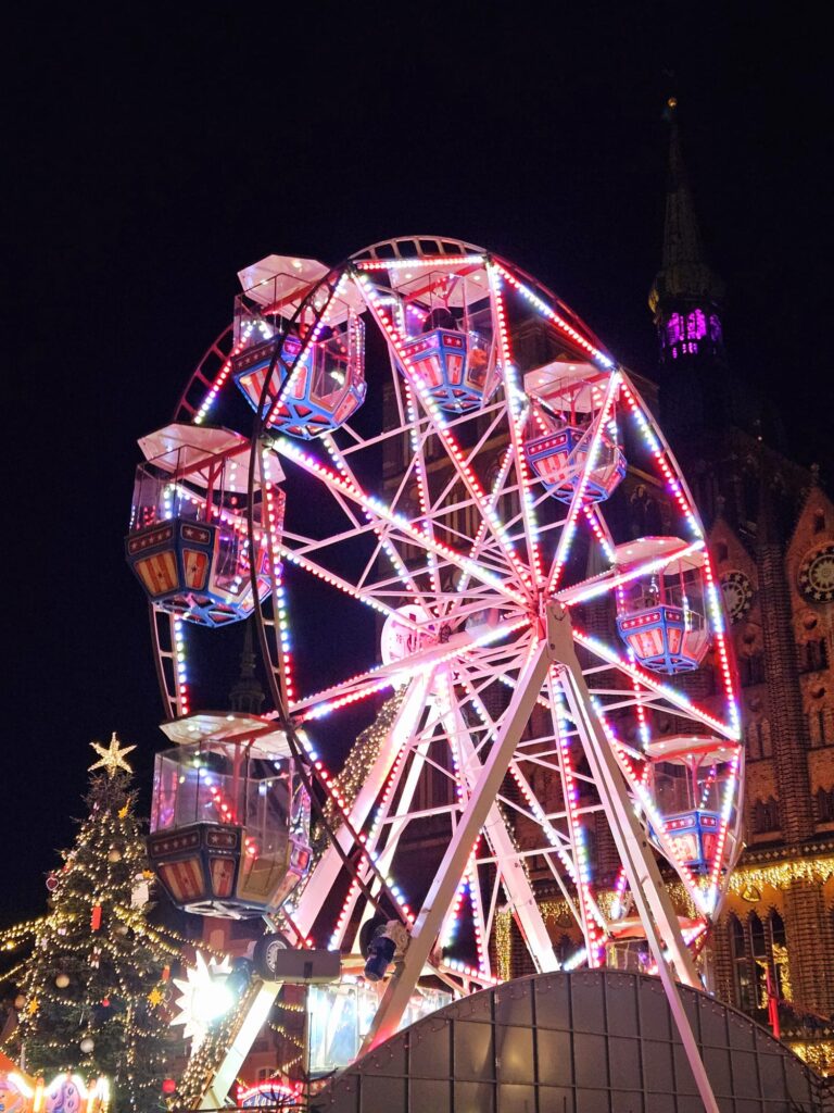 Geh´ auf den Rummel, stürz dich in das Getümmel auf dem Weihnachtsmarkt, atme den Duft von gebrannten Mandeln ein, iss´ einen Crepe oder Mutzen, und wenn es dich überkommt, dann fahr´ eine Runde Riesenrad – vielleicht ohne Glühwein vorher getrunken zu haben 🙂